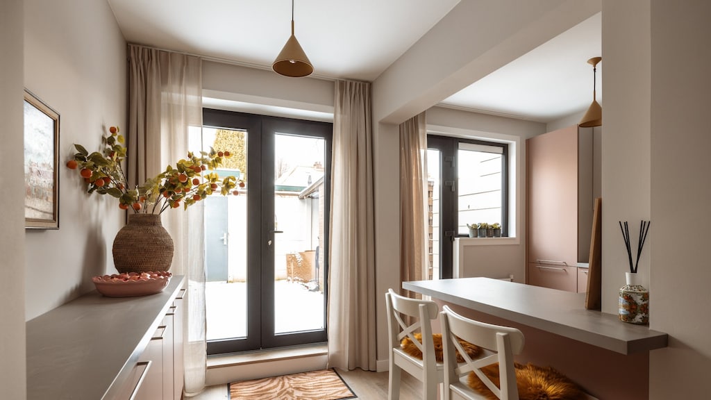 Keuken | Openslaande deuren | Kozijnen | Barkrukken | Fruitschaal | Rieten vaas