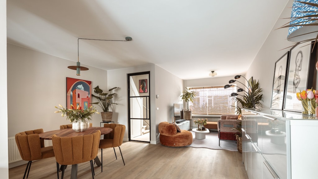 Eettafel van bewoner zelf | Eetkamerstoelen | Plafondlamp | Fauteuil | Vloer | Planten | Kunst | Bijzettafel