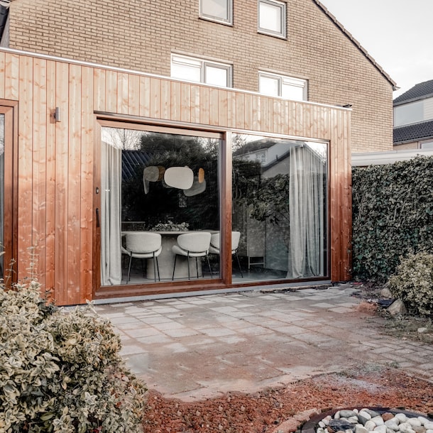 Maar ook wanneer er meer gasten blijven eten staat de kok in verbinding met zijn tafelgasten, want door de nieuwe uitbouw mét nieuwe (houten) pui is er genoeg plek voor een fijne eethoek naast de open keuken.