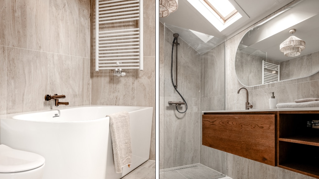 In de badkamer is er gekozen voor dezelfde natuurstenen tegels als in het toilet beneden, gecombineerd met donker notenhout badkamermeubel en een halfvrijstaand bad. Als dít geen spa-gevoel geeft…