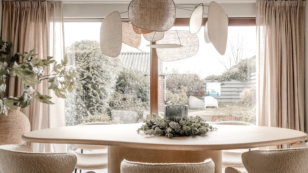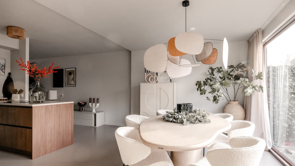 Er is gekozen voor een organisch gevormde eettafel, met crèmekleurige eetkamerstoelen van boucléstof. Boven de eettafel hangt een prachtige blikvanger van een lamp.