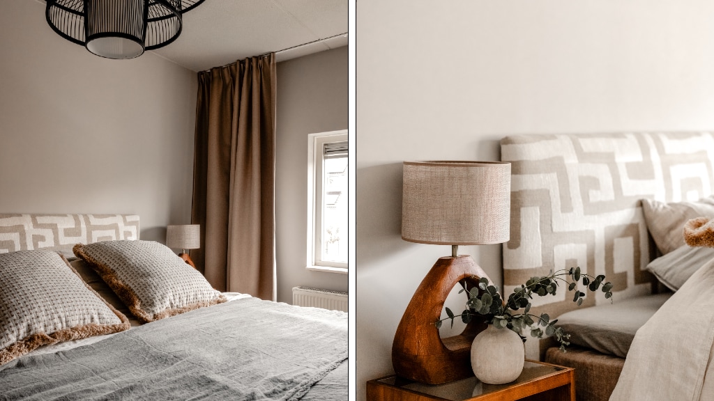Een andere kamer die een en al rust uitstraalt is de slaapkamer van Marlou en Ferdos. Ook hier zijn verschillende taupetinten, structuren en vormen met elkaar gecombineerd.