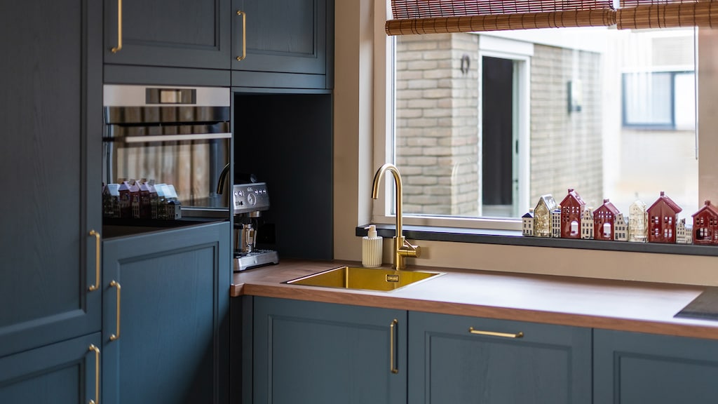 De keuken is gesloopt en daar voor in de plaats is een prachtige blauwe keuken gekomen, met het zo gewenste kookeiland. De kraan en wasbak zijn van messing en er is een apart koffiehoekje.