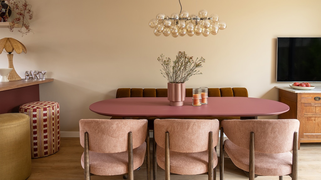 De eettafel is roze, iets waar Leroy nogal aan moet wennen. "Ik heb gewoon een roze tafel, godkolere", zegt-ie als hij het bekijkt. Toch ziet ook hij in dat het heel mooi is: "Het is prachtig, maar ik moet wel echt wennen aan alle kleuren in huis."