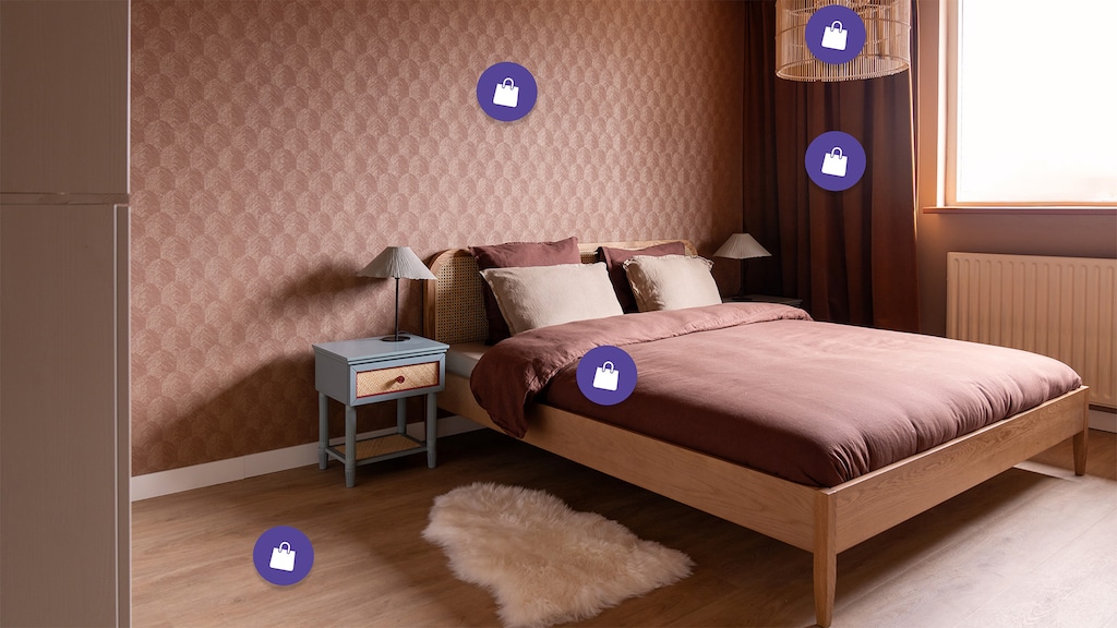 Gordijnen | Bed | Dekbed | Kussens | Nachtkastjes | Lamp | Behang | Vloer