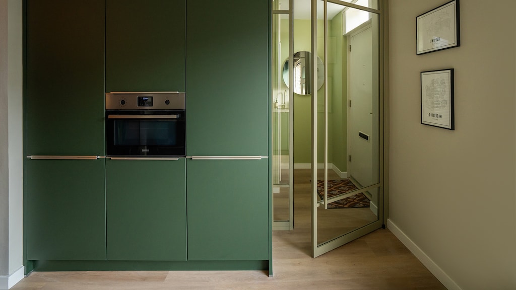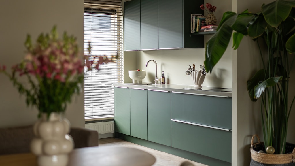 Je komt binnen in de groene keuken, met ingebouwde afzuiger in de kookplaat - precies zoals Kaj wilde. Ondanks de warme kleur, is de keuken strak afgewerkt, waardoor het geheel rustig blijft. Kaj wilde graag veel werkruimte in de keuken, dat is gelukt. Door het hele huis is gekozen voor een mooie pvc vloer die recht is gelegd, waardoor er optisch veel ruimte wordt gecreëerd. Qua jaloezieën is er gekozen voor een kleur die past bij de vloer.