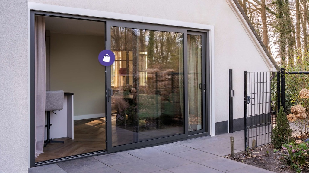 Foto rechts: glazen wand met scharnierdeur | houten jaloezieën